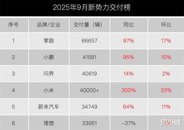 月销4万+这个级别有两位“小”字辈选手,小鹏和小米。小鹏汽车9月交付4.16万台,同比近乎翻番,创下历史新高,今年1-9月累计销量已超31万台,同比暴涨218%。持续热销的MONA M03,以及造型独特的全新P7,都吸引着许多年轻客群的关注。值得期待的是,小鹏汽车即将推出增程新车,2026年还计划实现现L4级自动驾驶技术量产。